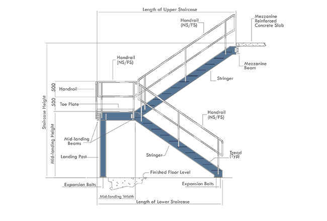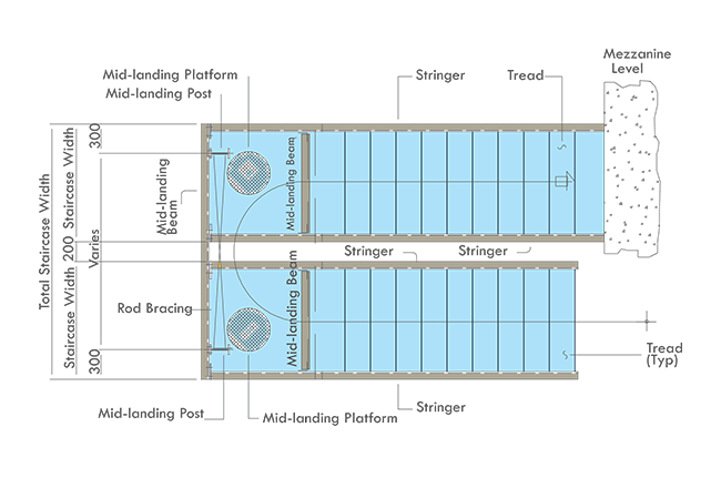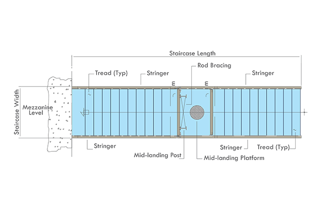 The standard mezzanine framing system consists of a steel deck support by joists into main mezzanine beams. If required by design loads, the main beams shall also be supported by intermediate columns. The top flange of the joists fit at same level of the top flange of the primary beams.
